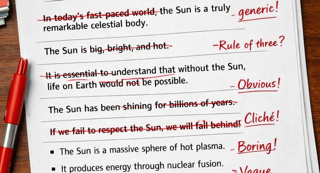 AI loves to reiterate and sum up content, so often you will find a short summary of a paragraph, which frankly just repeats the previous content.